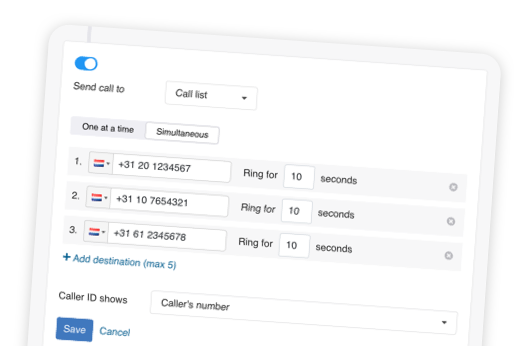 Thanks to the possibilities from XOIP, your organisation in can be reachable by your clients 24 hours per day. This is a reassuring though when you are travelin often and you want to be within reach for your business or family. At the same time regular local landline rates apply when your business partners, clients or family are trying to reach you. Efficient and effective.